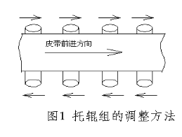 皮帶機的皮帶在整個皮帶運輸機的中部跑偏時可調整托輥組的位置來調整跑偏;在制造時托輥組的兩側安裝孔都加工成長孔,以便進行調整。具體調整方法見圖1 具體方法是皮帶偏向哪一側,托輥組的哪一側朝皮帶前進方向前移,或另外一側后移。如圖1所示皮帶向上方向跑偏則托輥組的下位處應當向左移動,托輥組的上位處向右移動。