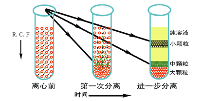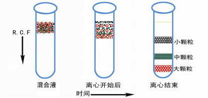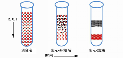 當(dāng)不同顆粒存在浮力密度差時,在離心力場下,顆粒或向下沉降,或向上浮起,一直沿梯度移動到它們密度恰好相等的位置上(即等密度點(diǎn))形成區(qū)帶,稱為等密度區(qū)帶離心法。等密度區(qū)帶離心的有效分離取決于顆粒的浮力密度差,密度差越大,分離效果越好,與顆粒的大小和形狀無關(guān),但后兩者決定著達(dá)到平衡的速率、時間和區(qū)帶的寬度。