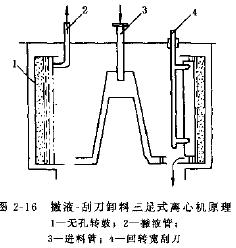 機構:如圖所示,撇液式轉鼓離心機主要有轉鼓(長徑比約為0.6)、撇液管和刮刀組成。
