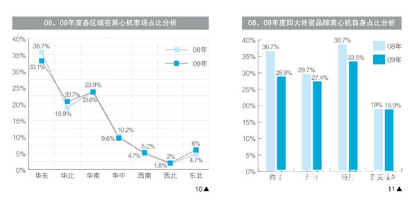 據統計,2009年度中,在“龍之夢”等項目的帶動下,東北市場成為離心機市場中的異類,繼續保持了一定幅度的增長,而華東、華北、華南、華中、西北、西南六大區域離心機市場規模分別出現了不同程度的下滑,其中經濟**為發達、市場整體規模**大華東地區自身規模下滑**大,同時,大部分地區離心機市場在區域整體市場中的占比(圖8),以及離心機在區域冷水機組市場中的占比也都出現下滑(圖9),也再次說明了離心機市場整體下滑**直接的原因來自市場外部經濟環境的影響。然而,各區域自身規模的變化并沒有給其在離心機市場占比帶來明顯的影響,華東、華南、華北三大市場依然是離心機市場的主角,占比均超過了20%,其他幾大區域依然維持在10%之下(圖10)。這也印證了離心機市場的發展規律與區域經濟發展狀況的密不可分。在這樣的情況下,相信離心機市場的區域分布格局也將比較穩定。