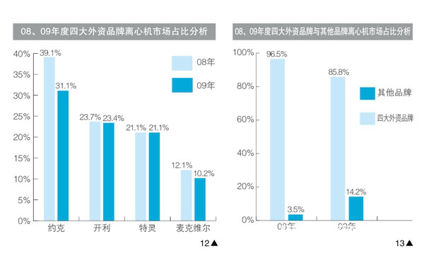 如果將四大外資品牌稱為離心機市場的**中堅力量,那么在其身后尾隨都可以歸納為離心機市場的新生部落。對比兩個群體在09年度中的表現,與前者全面下滑的無奈形成鮮明對比的是,離心機市場的新生代們卻呈現出了蓬勃的朝氣,頓漢布什、LS、美的、格力等品牌增長幅度驚人,世紀東元、盾安等紛紛涉足離心機市場。盡管這些新力量在傳統的離心機市場中帶來了新鮮的血液,也將給傳統的優勢力量帶來一些沖擊,在市場規模力量對比上發生了變化(圖13),但毋庸置疑的是,這些新生勢力的增長**主要的原因是之前的市場基數較小。