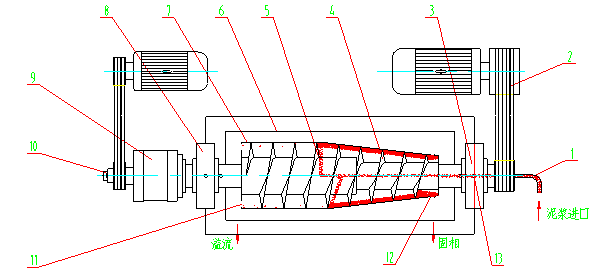 1. 接線錯誤造成旋轉方向錯誤; 2.傳動膠帶打滑或偶合器油不足,造成轉鼓速度不夠; 3.泥漿物理性能不合適; 4.螺旋推料器葉片嚴重磨損; |