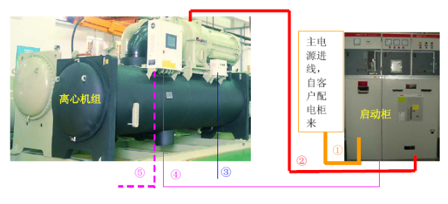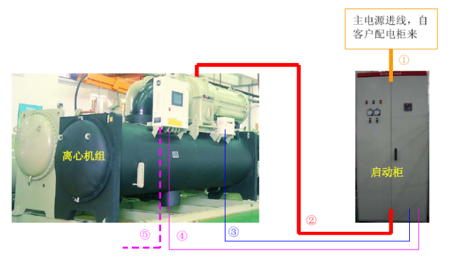 2、線②為從啟動柜**離心機組主電機的動力線(星三角啟動,6 根動力線,帶地線)。動力線從啟動柜下端出線,線徑要求隨機組功率調整。