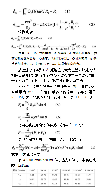 離心機,轉子在使用中飛裂發生了數次。 某醫學院進口日立超速機,一只 50000r/min 角轉子中斷幾 年沒使用,后來重新使用時,轉速升** 40000r/min 轉子即飛 裂,造成重大損失。因此轉子強度及安全一直是G內外生 產廠商和用戶**關心的問題。那么影響轉子強度的原因是 什么呢?本文試圖通過對解轉子的應力分析、強度計算、安 全系數的選擇以及飛裂殘骸分析來論述轉子裂紋產生原 因,提出預防措施。 1 角轉子應力分析 如圖 1 所示,角轉子具有 2n 個直徑為 d 的對稱分布 離心孔,中心具有導向通孔 d1 和定位錐孔 。當轉子繞定 軸旋轉時,任一質點產生的離心力為 Fi=miRiw2(mi 為任一 質點,Ri 為質點質點回轉半徑,w 為質點角速度)。由于轉 子形狀復雜,各質點體積力不同,產生了附加彎矩。為了弄 清轉子受力狀態,找出危險截面,對轉子進行了光彈實驗。 通過對環氧樹脂轉子動態應力凍結、切片及應力條紋測量, 得到了圖 2、3、4 轉子應力分布圖。通過實驗發現轉子處于 三向不等應力的拉伸和壓縮,而且切向應力 t 總是大于徑 向應力 r 和軸向應力 z 應力**大區域在通過 A 點的圓周 上(見圖 2)。A 點的高度在 錐孔小端附近,與轉子**大外 徑高度基本一致。通過測量得到 A 點處于兩離心孔之間 (無孔)的應力大于處于離心孔(有孔)中的應力。測量結果 見表 1。