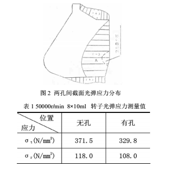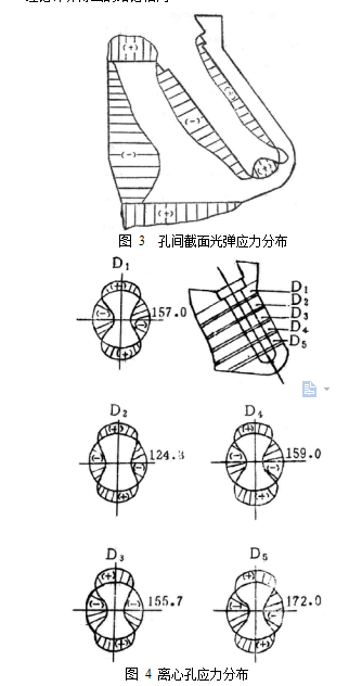圖 4 表示垂直于離心孔軸線不同截面應力分布。從測量得到,離心孔沿轉子直徑方向受拉力,沿轉子圓周方向受壓力,而且位于轉子下端的應力比上端大。