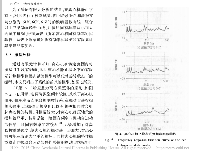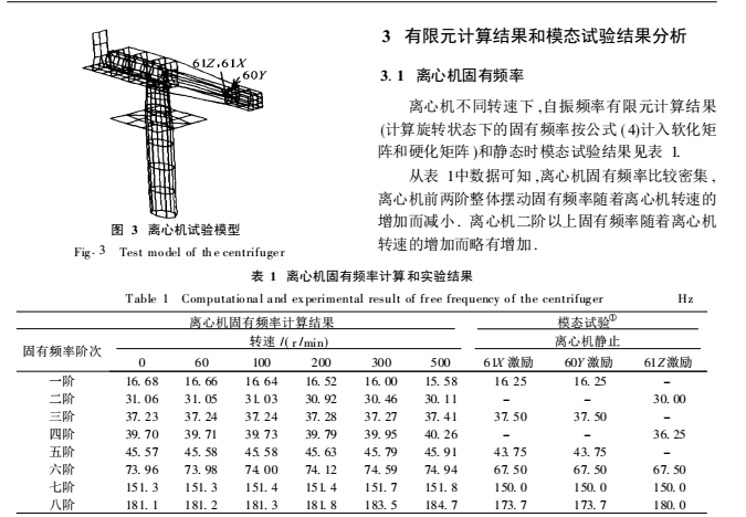( 1)離心機臂靜態時的固有頻率有限元計算結果與模態試驗結果符合得較好 .在旋轉狀態下 ,旋轉軟化效應使得**、二階固有頻率隨著離心機轉速的增加而減小 ,而剛度硬化使得離心機兩階以上與彎曲振型有關的固有頻率隨著離心機轉速的增加而略有增加.