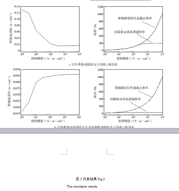 N·m/rad等9個等級進行仿真,并通過調節轉速環增益系數 改變伺服驅動系統的調速頻率,使離心機系統的轉速波動量**值期望達到**小(單位:rpm)。仿真結果如圖3所示,其顯示了在兩類仿真目標下,隨著聯軸器扭轉剛度的增長,離心機系統轉速波動量的對應變化趨勢。