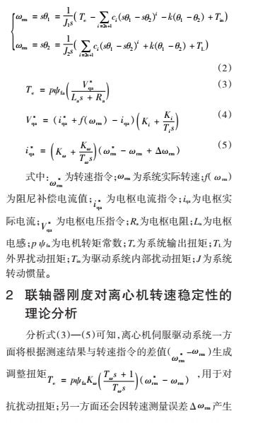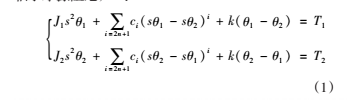 θ(2由轉速傳感器的安裝位置決定);k,ci 分別為聯軸器的扭轉剛度與第i 階扭轉阻尼系數;s為微分算子。由此可得整合了聯軸器結構的伺服驅動系統控制過程的數學表達式,如式(2)—(5)所示,其中