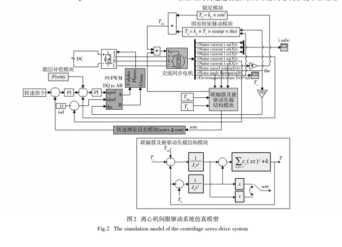 矢量控制交流同步電機方案,建立如圖2所示的整合了聯軸器結構的離心機伺服驅動系統Matlab/Simulink數學仿真模型,并利用聯軸器扭轉剛度對離心機系統轉速穩定性的影響開展仿真分析。