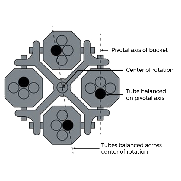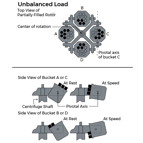 大多數(shù)離心機(jī)配備有不平衡檢測(cè)器,在由負(fù)載不平衡引起的任何偏心旋轉(zhuǎn)可能損壞驅(qū)動(dòng)軸或軸承之前關(guān)閉離心機(jī)。然而,即使不平衡不足以觸發(fā)該探測(cè)器,管道在載體或適配器中的不正確分布也會(huì)導(dǎo)致分離不良。在這些情況下,鏟斗在運(yùn)行期間不會(huì)樞轉(zhuǎn)到所需的水平位置,導(dǎo)致在減速期間密度差的分離或沉積材料的重新混合。而且,當(dāng)鏟斗在操作速度下不是水平時(shí),在運(yùn)行期間管破裂的可能性大大增加。