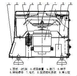 該機結構簡單,蓋門、機殼采用高強度工程塑料制成,轉子直接有電機驅動,減震系統采用先進的結構和加工工藝,變頻控制、操作方便。其結構簡圖如下所示: