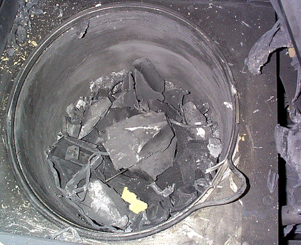 隨后的爆炸徹底摧毀離心機(圖1)在單位安全防護沒有包含所有的金屬碎片。半英寸的扣允許片段,包括鋼轉子頂部單元的頂部厚推拉塑鋼門,逃生(圖3)。片段毀了附近的冰箱,除了使在墻壁和天花板孔超低溫冰箱冷凍。該單位本身側身走,破壞包含百余容器的化學品(圖4)柜和貨架。幸運的是,推拉柜門掉落到地板上,打破防止容器。從事故的沖擊波震碎房間中的所有四個窗口。沖擊波還破壞了控制系統的孵化器和震撼的內墻導致擱置在墻上崩潰(圖5)。幸運的是,房間里當時沒有占*,沒有人員受傷。
